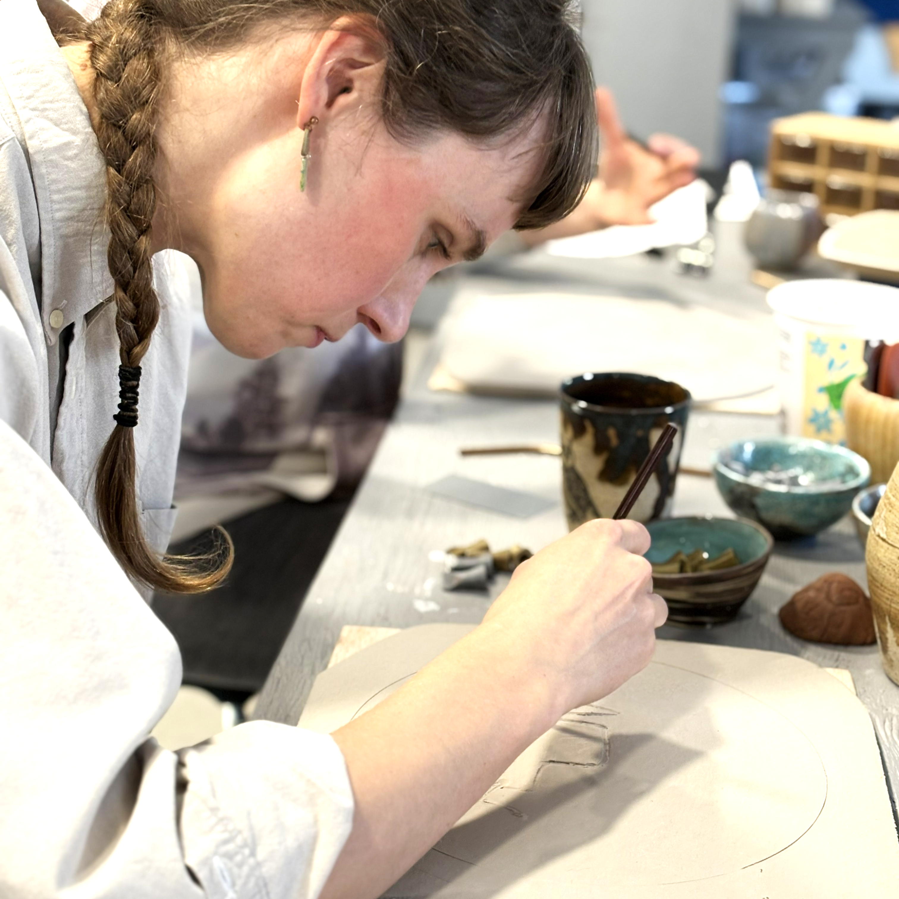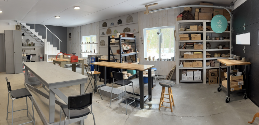 À l’intérieur : trois longues tables de travail, assez de place pour accueillir dix à douze personnes et qu’elles puissent vraiment s’étaler. Un tour à poterie, une galeteuse, un four. Des toilettes. En été, selon la météo et le groupe, on déborde parfois dehors — tables de pique-nique, les arbres, le genre d’après-midi qu’on n’avait pas prévu.